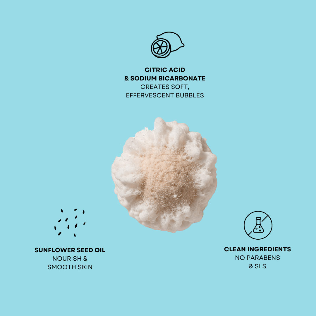 Creates soft, effervescent bubbles with Citric Acid and Sodium Bicarbonate
